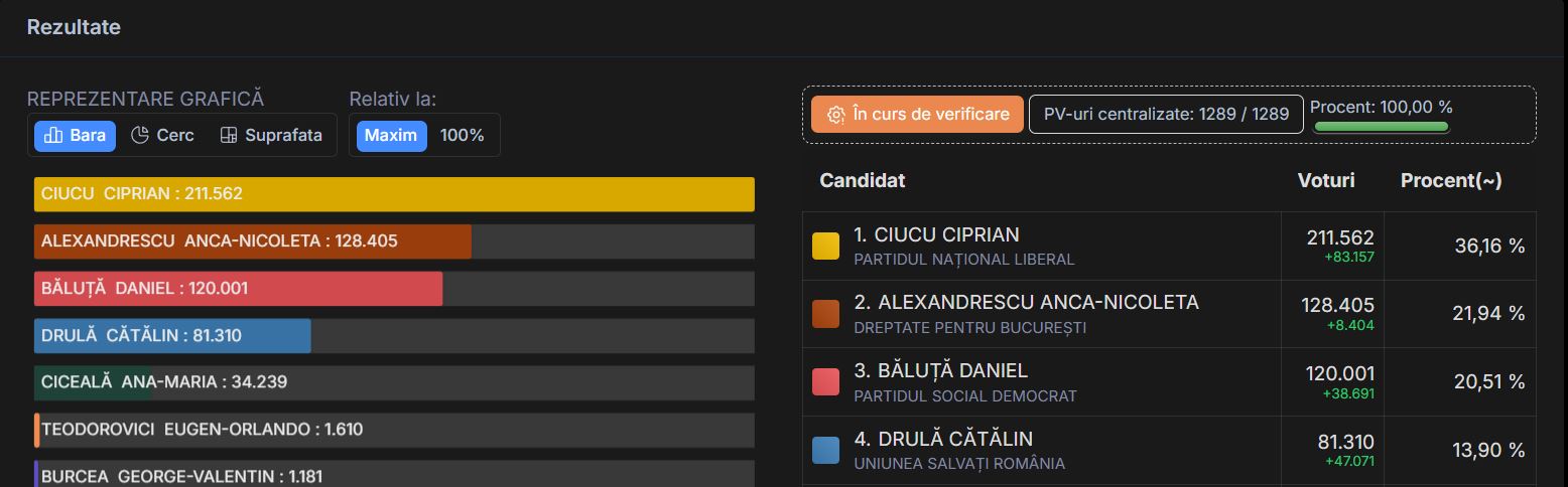 Rezultate Alegeri Primăria Capitalei 2025. Candidatul PNL pentru funcţia de primar general, Ciprian Ciucu, a obţinut 36,16% dintre voturile exprimate la alegerile de duminică, după centralizarea voturilor exprimate. El este urmat de Anca Alexandrescu (21,94%), Daniel Băluţă (20,51%) şi Cătălin Drulă (13,90%).