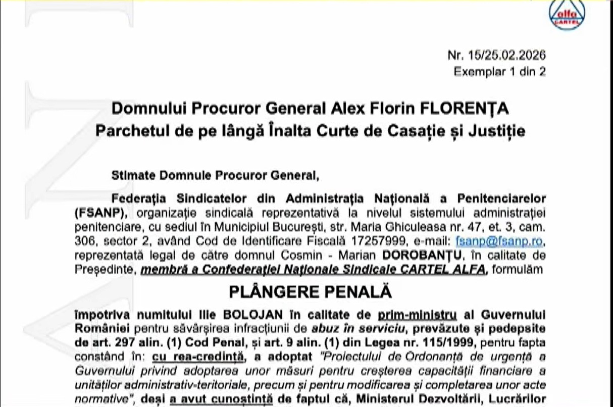 Potrivit România TV, Cosmin Dorobanțu, președintele Federației Sindicatelor din Administrația Națională a Penitenciarelor (FSANP), a făcut plângere penală la Parchetul General împotriva premierului Ilie Bolojan. Sindicaliștii s-au săturat de austeritatea impusă de șeful Guvernului și cer demisia lui Bolojan.
