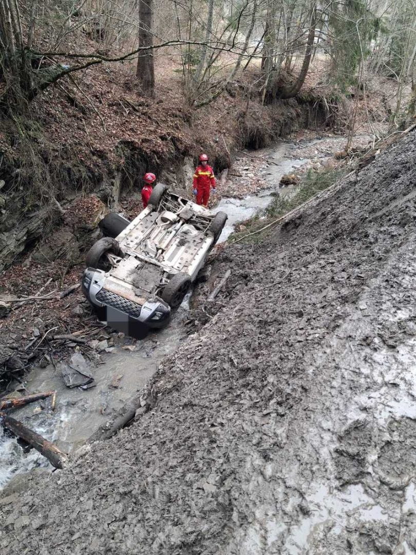 ”În această dimineaţă, în jurul orei 09:00, prin apel la 112 a fost sesizat faptul că o maşină este căzută într-un pârâu din comuna Poiana Teiului (într-o râpă de cu o adâncime de aproximativ 7 m din satul Petru Vodă)”, a transmis, sâmbătă, ISU Neamţ.