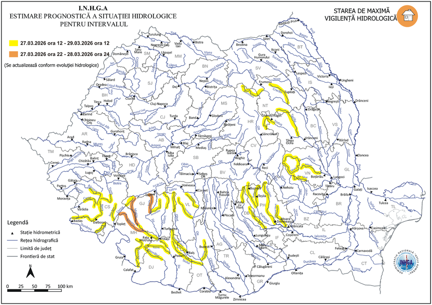 ”Având în vedere situaţia hidrometeorologică actuală şi prognoza pentru următoarele 48 de ore, ca urmare a precipitaţiilor prognozate, cedării apei din stratul de zăpadă şi propagării, I.N.H.G.A. actualizează Atenţionarea Hidrologică emisă în cursul zilei de ieri”, anunţă, vineri, I.N.H.G.A.