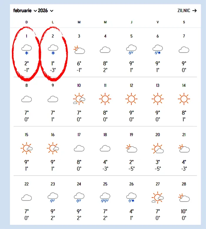 Prognoza pe luna februari arată clar această schimbare bruscă a vremii. De la 10 grade, în ultima săptămână din ianuarie, la temperaturi scăzute, cu precipatiții chiar sub formă de ninsoare în prima zi a lunii februarie.