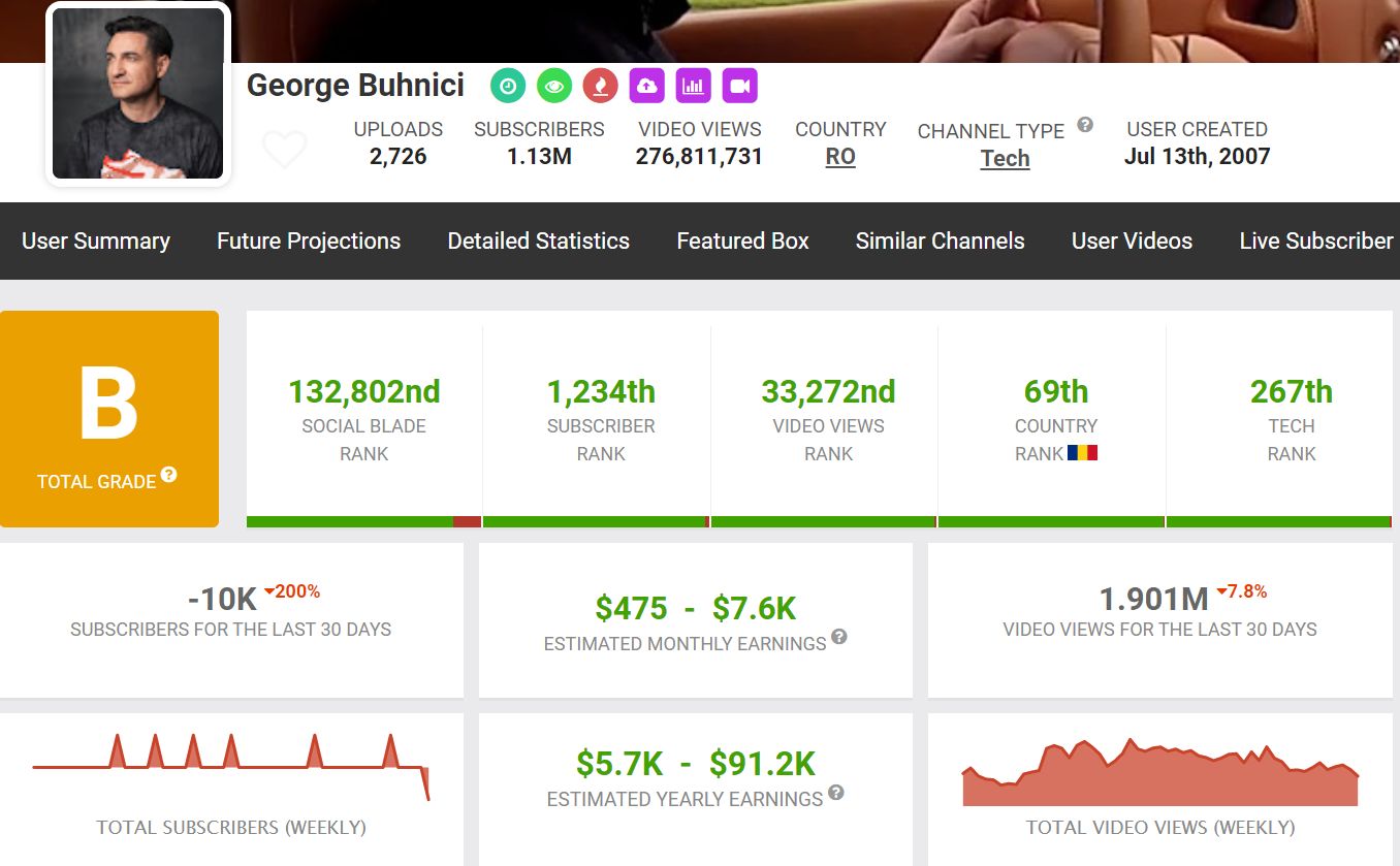 George Buhnici şi-a deschis canalul de YouTube încă din 2007, în timp ajungând la peste un milion de abonaţi. Conform datelor oficiale, acesta câștigă, lunar, între 475 de dolari și 7.000 de dolari. Anual, vlogger-ul încasează din YouTube o sumă care se încadrează între 5.700 de dolari și 91.000 de dolari!