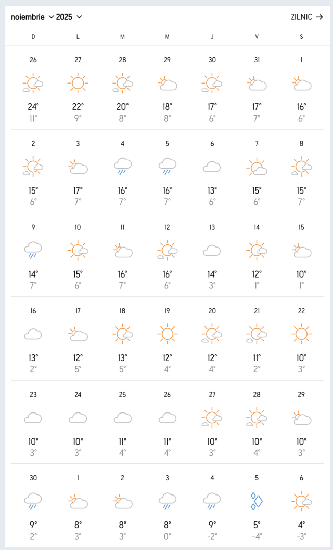 Meteorologii de la Accuweather susțin că luna noiembrie este una în care vom avea ploi, nori, dar vor fi și zile în care soarele se arată timid. Temperaturile maxime nu vor depăși 16 grade Celsius, iar minimele vor coborî până la 1 grad Celsius.