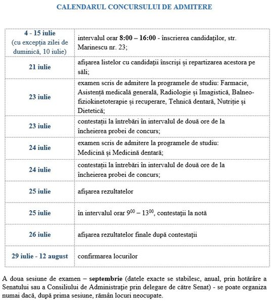 Pentru cei care vor să studieze Medicina în limba engleză este valabilă aceeași perioadă de înscriere și validare a dosarului. Data concursului, testul la limba engleză, este pe 25 iulie, iar la examenul la Biologie și Chimie va fi pe 26 iulie. Primele rezultate vor fi afișate pe 27 iulie, iar confirmarea locurilor se va face pe între 27 și 29 iulie.