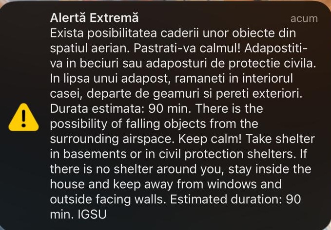 În județele Vrancea și Galați au fost trimise, marți dimineață, mesaje prin sistemul RO-Alert cu privire la posibilitatea căderii de drone!