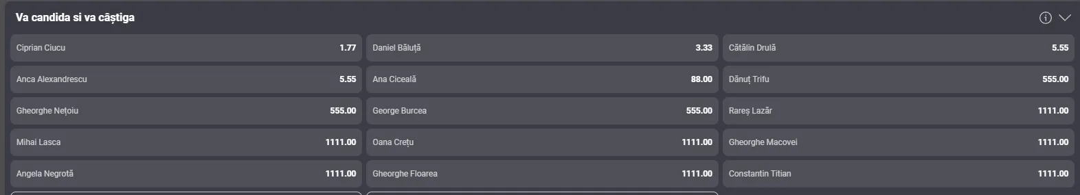 Casele de pariuri îi oferă o cotă de 1.77 lui Ciprian Ciucu, ceea ce înseamnă că la 100 de lei pariați ar urma să câștigi 177 de lei.