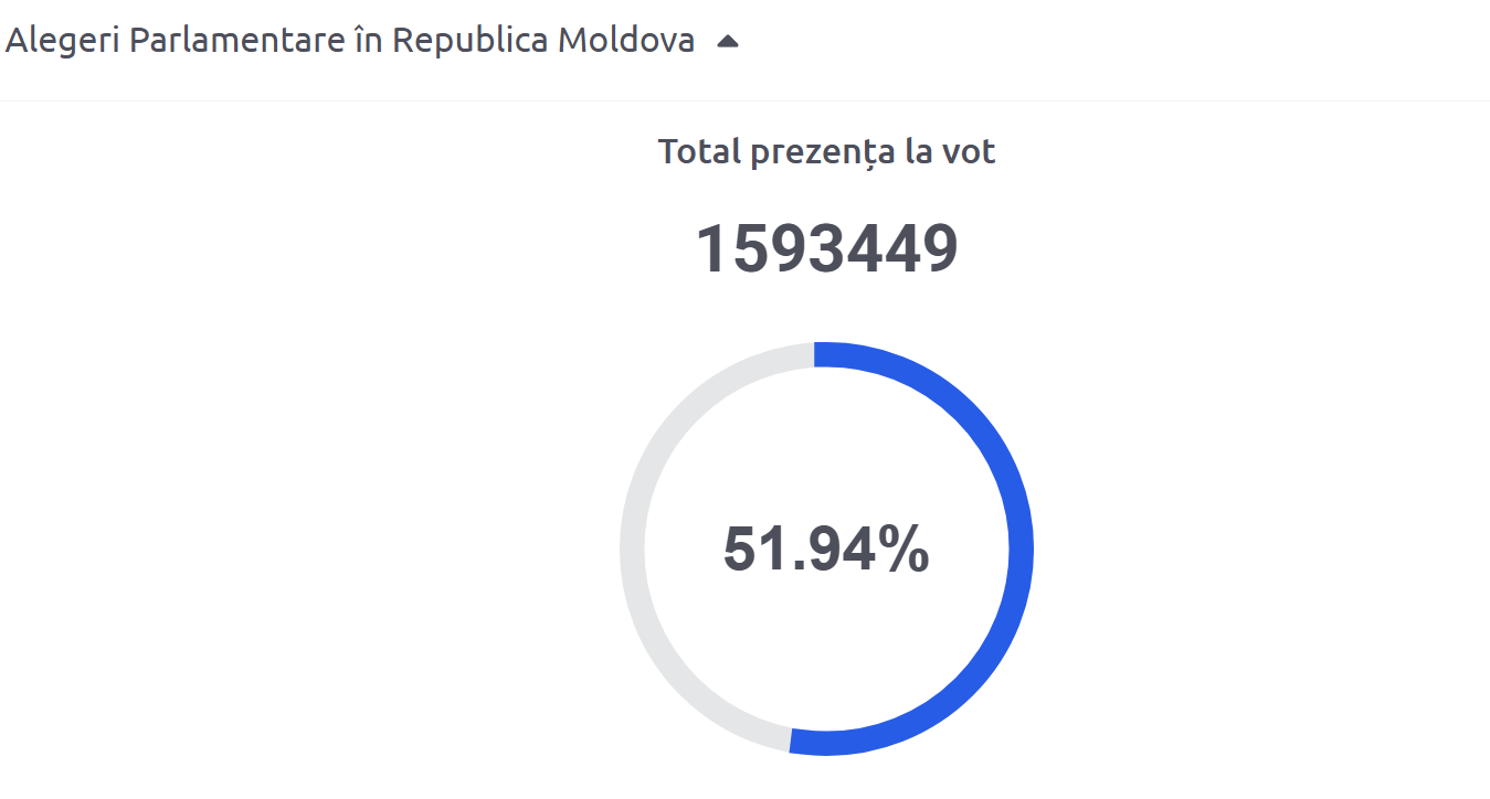 UPDATE: Pragul de 50% prezență la alegerile din Republica Moldova a fost atins la ora 19:37, adică 1.521.586 de moldoveni au votat până acum în țară și în diaspora. În țară au votat 1.277.335, în timp ce în diaspora, numărul votanților a ajuns la 244.366.