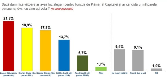 Ciprian Ciucu se plasează pe locul al doilea în intenţiile de vot, cu 18.9%, în scenariul în care contracandidaţii săi sunt: Daniel Băluţă (PSD) – 21%, Anca Alexandrescu (AUR) – 16,9%, Cătălin Drulă (USR) – 14,7%, Ana Ciceală (SENS) – 6,8%, procentele fiind raportate la totalul populaţiei. Clasamentul se menţine, dar procentele cresc uşor în cazul în care se raportează la populaţia care declară că va merge la vot în mod cert. Anca Alexandrescu a anunţat joi, după ce data de 7 decembrie pentru organizarea alegerilor în Bucureşti a devenit oficială, că 99% va candida.
