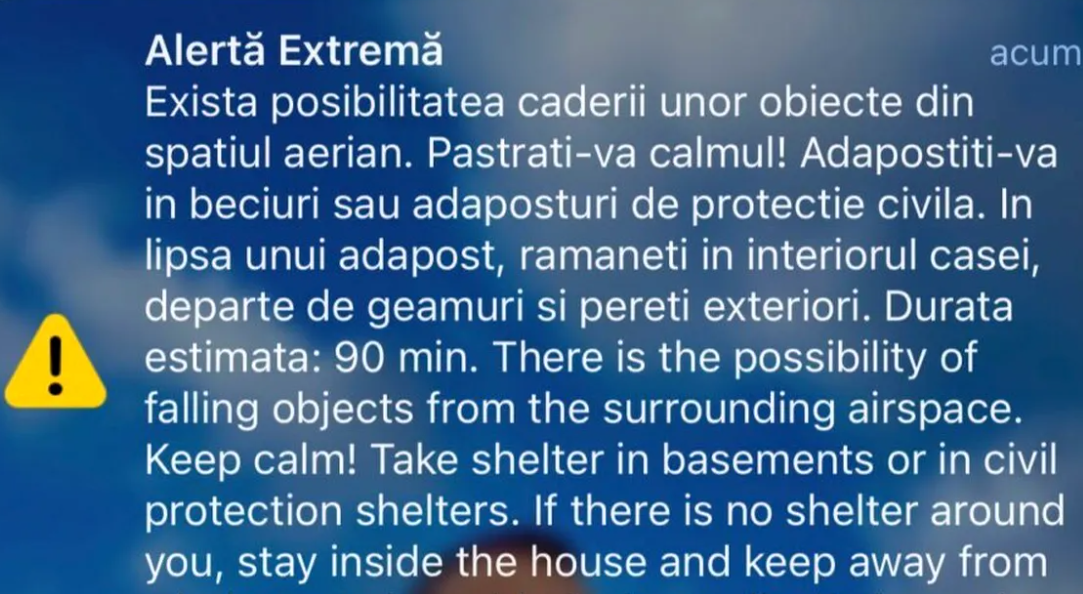 Inspectoratul General pentru Situații de Urgență a transmis un mesaj RO-Alert în noaptea de miercuri spre joi, pentru locuitorii nordul județului Tulcea prin care au fost informați despre posibilitatea căderii unor obiecte din spațiul aerian și prin care le-au fost transmise recomandări de autoprotecție, potrivit Mediafax.
