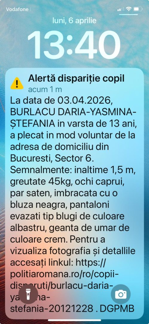 Autoritățile fac apel la populație pentru a da de urma fetei de 13 ani. Daria Ștefania locuiește în sectorul 6 al Capitalei, iar în momentul în care a plecat de acasă era îmbrăcată cu o bluză neagră, o pereche de pantaloni evazați tip blugi, de culoare albastră și avea o geantă de umăr de culoare bej.