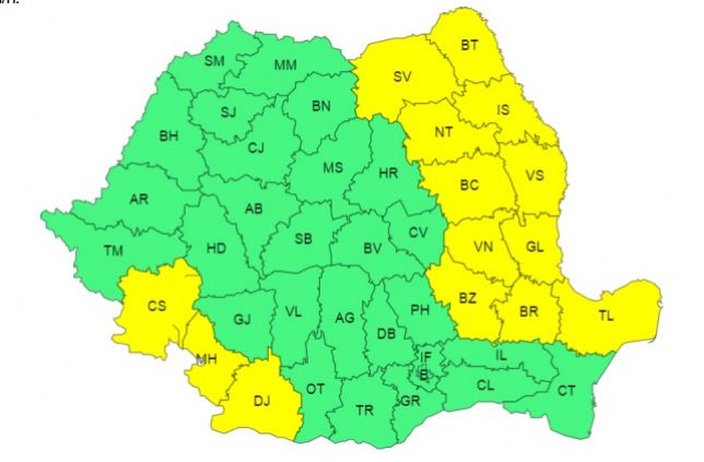 Meteorologii anunță în intervalul 02 noiembrie, ora 12 – 02 noiembrie, ora 20 cod galben de intensificări ale vântului. În intervalul menționat, vântul se va intensifica în Moldova, nord-estul Munteniei, în nordul Dobrogei, sudul Banatului și sud-vestul Olteniei, cu viteze de 55…65 km/h și izolat de 70 km/h. În Carpații Orientali vor fi rafale de 70…90 km/h.