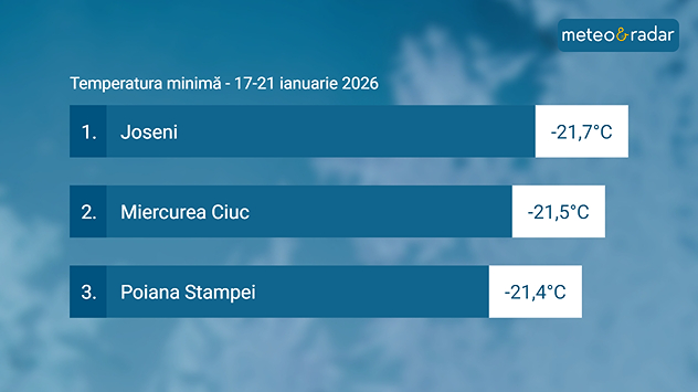 În perioada 19 ianuarie, ora 20 – 21 ianuarie, ora 20, meteorologii anunță temperaturi minime cuprinse între -14 și -6 grade la peste 1.800 m și maxime de până la 2 grade, respectiv minime între -11 și -5 grade și maxime de până la 5 grade sub această altitudine.