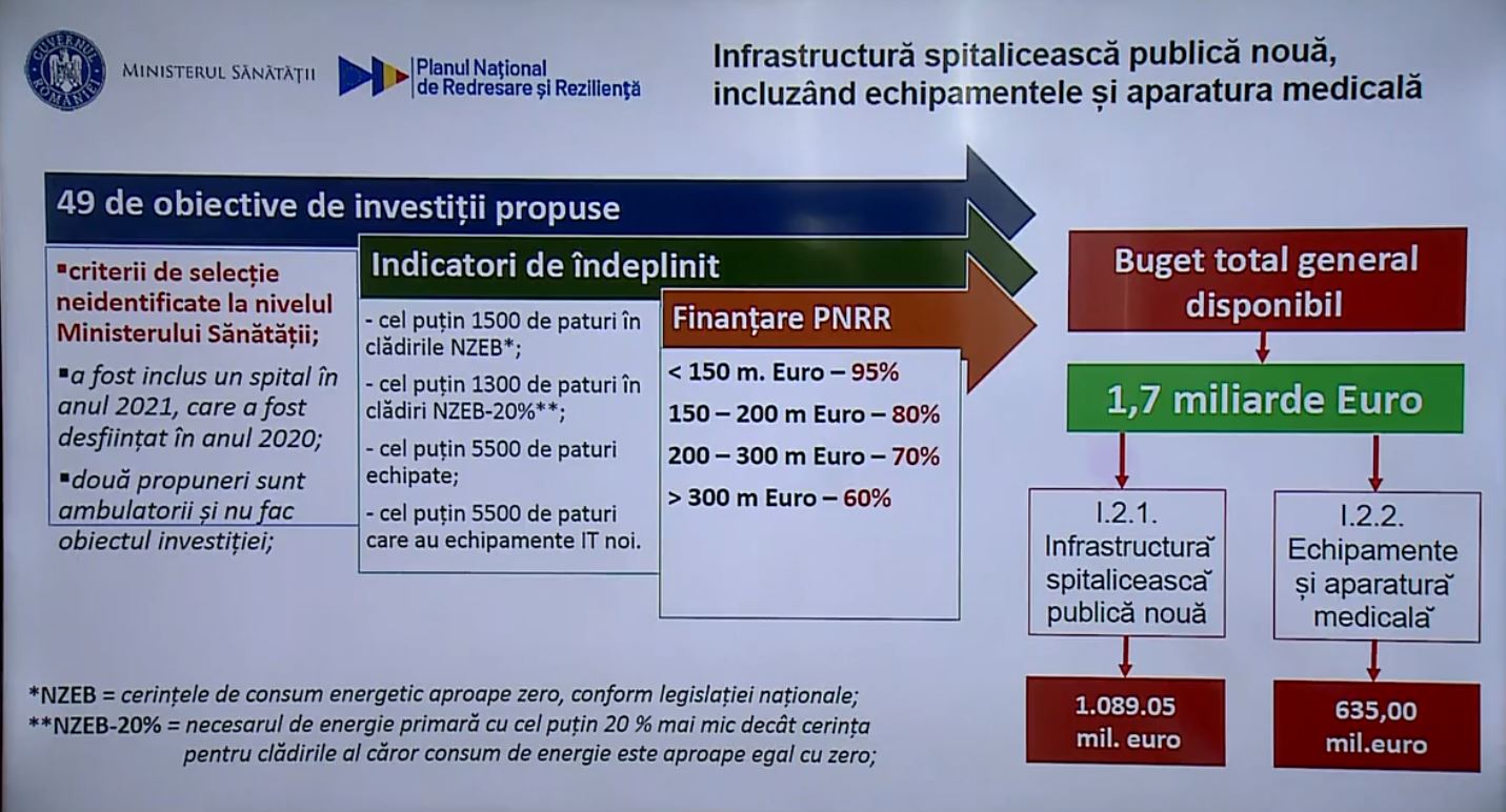 Avem un buget de 1,7 miliarde de euro. 1,089 miliarde de euro pentru infrastructură spitalicească nouă; 635 de milioane pentru aparatură medicală.