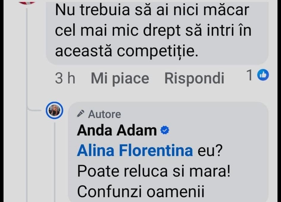 Recent, o femeie i-a scris la una dintre postările de pe rețelele sociale: „Nu trebuia să ai nici măcar cel mai mic drept să intri în această competiție”. Anda Adam a reacționat imediat cu o replică acidă: „Eu? Poate Raluca și Mara. Confuzi oamenii”, a răspuns cântăreața.