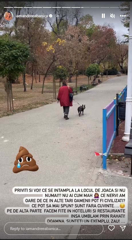 ”Eram și eu fericită cu copilul în parc și am călcat într-un c****. Măi fraților, băi nu vă mai lăsați câini așa, luați pungă, măturică, ceva, orice și adunați-va rahații. Mi-am luat converși noi și am călcat în c***. Superb! Priviți și voi! Ce se întâmplă la locul de joacă ți nu numai!!! Nu ai cum. Ce nervi am, oare de ce în alte țări oamenii pot fi civilizați? Ce pot să mai spun? Sunt fără cuvinte…Pe de altă parte, facem fițe în hoteluri și restaurante, însă umblăm prin rahați! Doamnă, sunteți un exemplu, zău!”, a spus Andreea Bănică pe Instagram.
