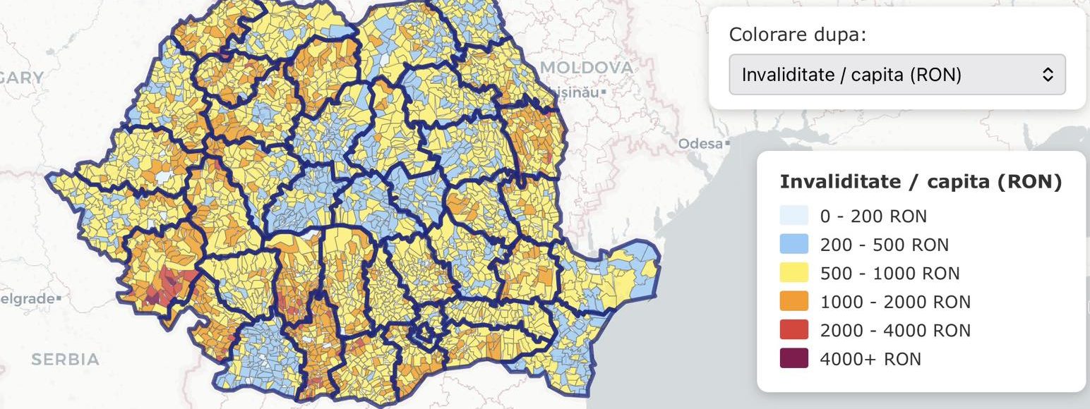Mai jos e harta cu cheltuielile per capita pe ajutoare sociale pentru handicap (faimoasele certificate care se iau cu șpaga și prin rețele din teritoriu). Avem 1.4 milioane de oameni care cică pe hârtie ar avea “handicap”. Vedeți mai jos unde sunt.