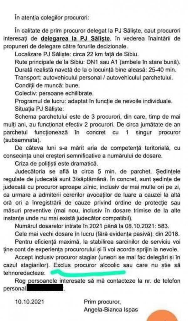 Angela-Bianca Ispas le cere celor interesați să o contacteze, urmând ca ea să solicite Secției pentru procurori a CSM delegelarea la PJ Săliște. Dacă se acceptă și procurori stagiari, șefa PJ Săliște este cât se poate de clară cu privire la alt aspect: nu se acceptă procuror alcoolic.