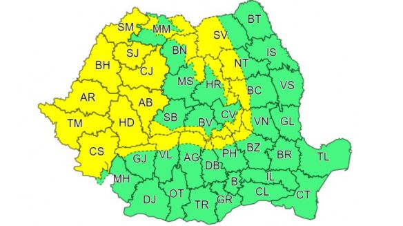 Codul galben a intrat în vigoare astăzi de la ora 10 și este valabil până luni dimineața, la ora 02.00.