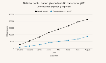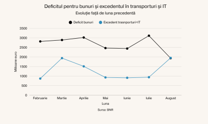 În august, conform datelor BNR, România a importat bunuri în valoare mai mare cu aproape două miliarde de euro decât exporturile, sumă ceva mai mică decât deficitul înregistrat în fiecare lună a acestui an. Pentru prima dată însă în acest an, excedentul de euro provenit din activitatea de transporturi și cea din telecomunicații și IT a depășit deficitul din comerțul cu alimente și haine (principalele elemente din categoria bunuri). Mai exact, deficitul la categoria bunuri a crescut în august cu 1,94 de miliarde de euro, în timp ce excedentul cumulat din transporturi și IT a urcat cu 1,95 de miliarde de euro.