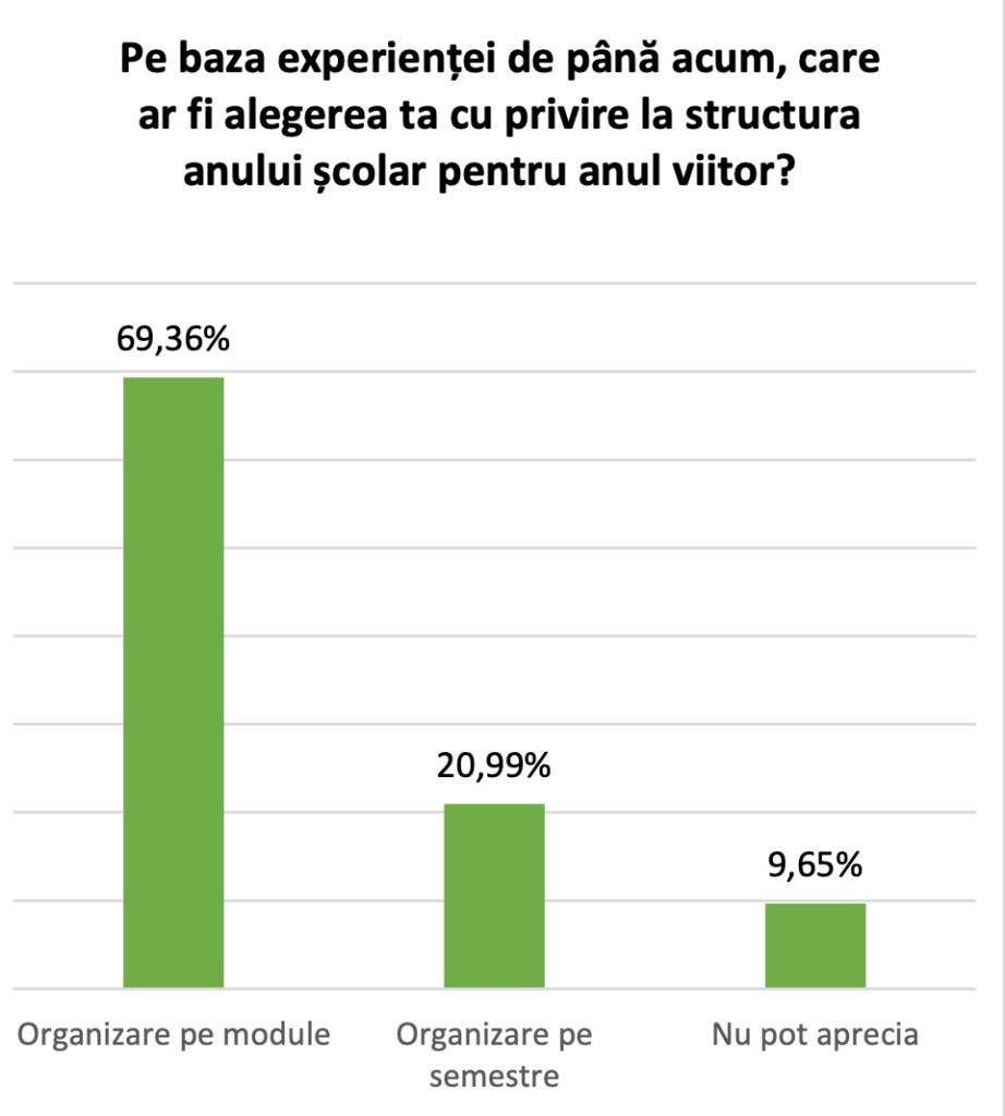 69% dintre elevi preferă structura anului școlar pe cinci module de studiu separate de cinci vacanță, comparativ cu 20,9% în cazul organizării pe semestre.