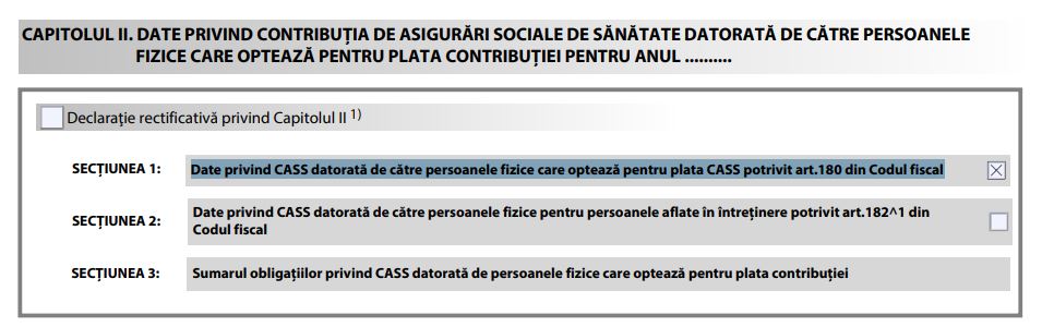 Dacă sunteţi persoană fără venituri fiscalizate, veţi bifa secţiunea 1 “date privind CASS datorată de către persoanele fizice care optează pentru plata CASS potrivit art.180 din Codul fiscal”.
