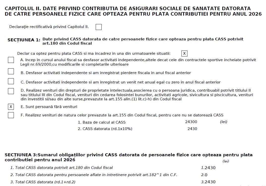 Vă interesează capitolul II – „date privind CASS datorată de către persoanele fizice care optează pentru plata contribuţiei pentru anul”. Aici veţi scrie „2026”.