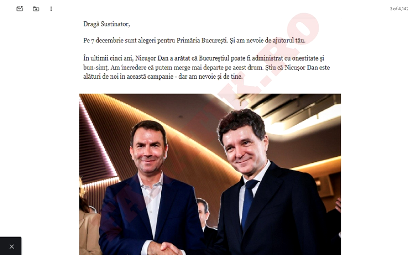 „Pe 7 decembrie sunt alegeri pentru Primăria București. Și am nevoie de ajutorul tău. În ultimii cinci ani, Nicușor Dan a arătat că Bucureștiul poate fi administrat cu onestitate și bun-simț. Am încredere că putem merge mai departe pe acest drum. Știu că Nicușor Dan este alături de noi în această campanie – dar am nevoie și de tine”, este mail-ul pe care l-a trimis Cătălin Drulă susținătorilor USR.