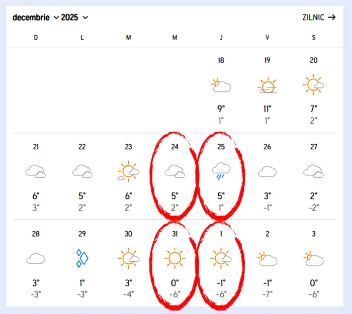 La finalul lunii, pe 31 decembrie, în București, va fi o atmosferă rece, dar însorită. Temperaturile se vor situa între 0 și minus 6 grade C, dar tot nu va ninge. La data de 1 ianuarie 2026, norii își vor mai face apariția, dar nu vor fi precipitații sub formă de ninsoare. Temperaturile se vor situa între -1 și -6 grade C, în București.