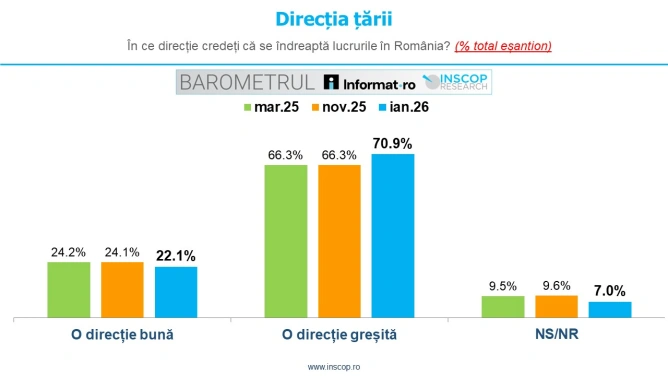 Barometrul INSCOP: 22.1% dintre respondenți sunt de părere că lucrurile în România se îndreaptă într-o direcție bună (față de 24.2% în martie 2025 și 24.1% în noiembrie 2025). 70.9% cred că lucrurile merg într-o direcție greșită (față de 66.3% în martie 2025 și 66.3% în noiembrie 2025), iar 7% nu știu sau nu răspund (față de 9.5% în martie 2025 și 9.6% în noiembrie 2025).