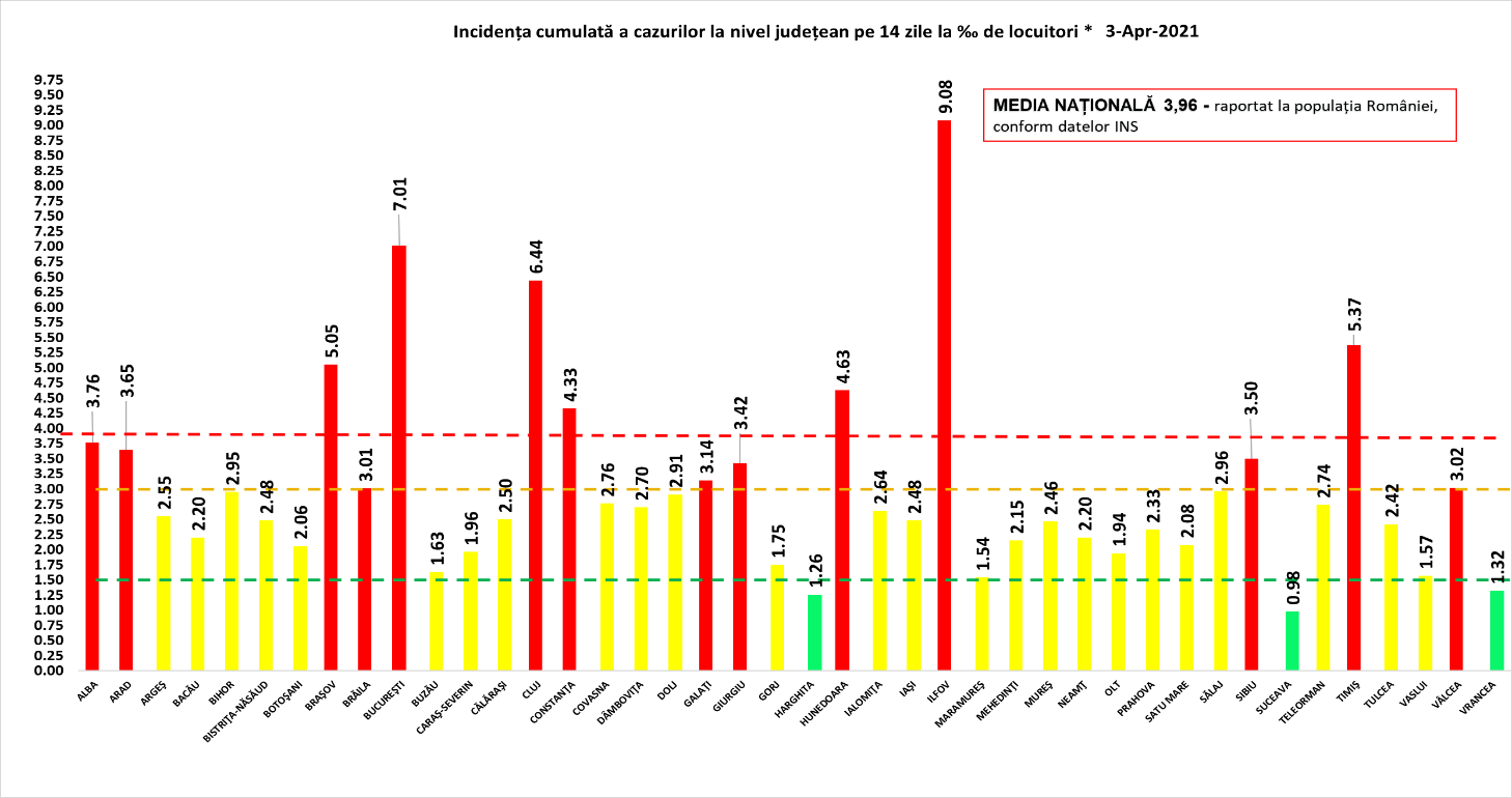 Bilanţ coronavirus 3 aprilie 2021. Coeficientul infectărilor cumulate la 14 zile, raportate la 1.000 de locuitori este calculat de către Direcțiile de Sănătate Publică, la nivelul Municipiului București și al județelor. Mai jos aveți graficul realizat în baza raportărilor primite de CNCCI de la Direcțiile de Sănătate Publică: