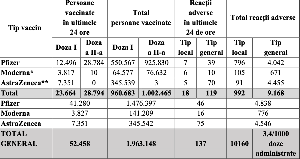 În total, de la debutul campaniei de vaccinare, 1.963.148 de persoane au fost vaccinate, dintre care 960.683 cu prima doză și 1.002.465 cu ambele doze. Dintre aceștia, 1.476.397 cu Pfizer, 141.209 cu Moderna și 345.542 cu AstraZeneca.