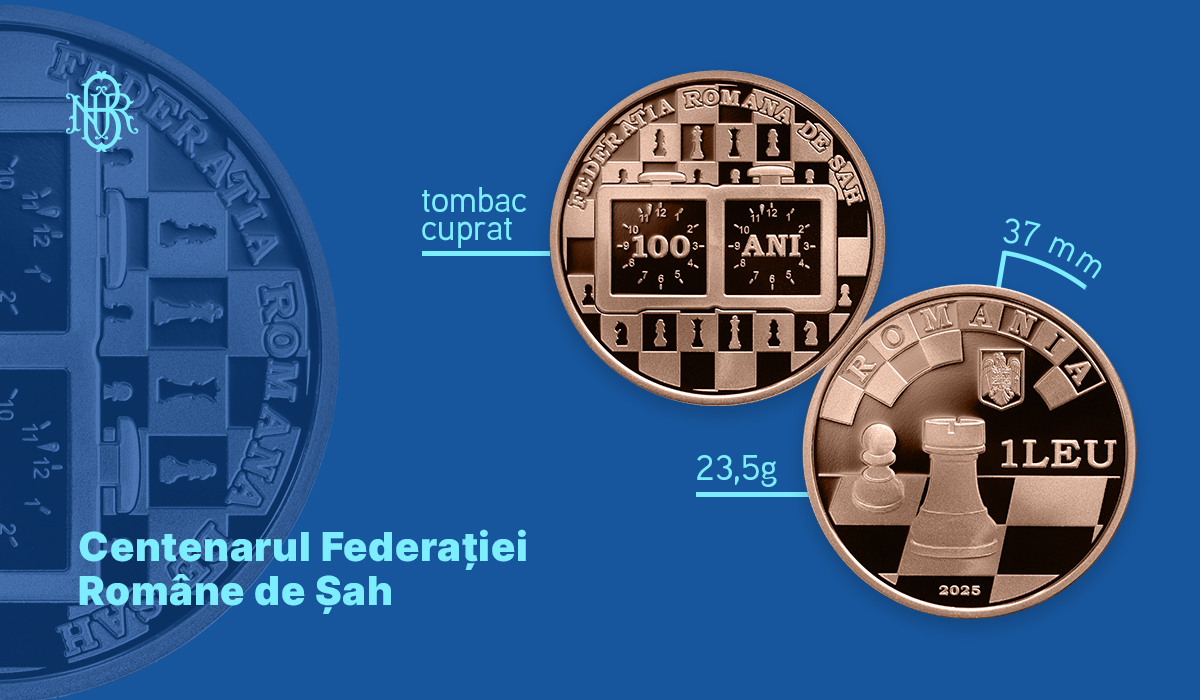 Banca Naţională a României (BNR) lansează pe 10 noiembrie în circuitul numismatic o monedă din tombac cuprat cu tema Centenarul Federaţiei Române de Şah, cu un preţ de vânzare de 240 lei, exclusiv TVA, inclusiv pliantul de prezentare şi mapa cartonată.