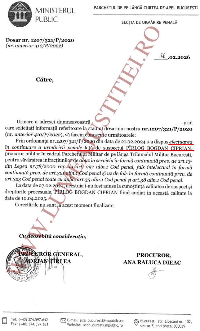 Colegii săi de breaslă de la Parchetul de pe lângă Curtea de Apel București (PCAB) îl au în vizor într-un dosar dosar de abuz în serviciu, fals și uz de fals! Pîrlog are calitatea de suspect în acest dosar, iar presupusele fapte pentru care este cercetat ar fi fost comise în formă continuată.