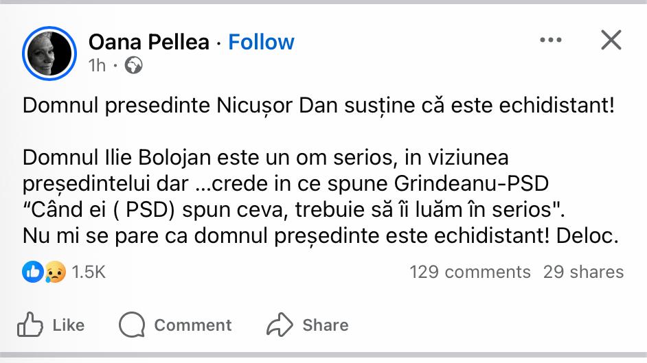 Domnule Președinte Nicușor Dan, ne puteți spune în ce a constat medierea dumneavoastră? Daca ați mediat…ați mediat prost…conflictul a explodat. Nu credeți că trebuie să vă asumați nereușita? Unii dintre noi v-am votat și ne-am pus speranțele în dumneavoastră, alții v-au votat ca fiind răul cel mai mic, alții v-au votat pentru că ați promis că îl veți numi în funcția de Prim Ministru pe Domnul Ilie Bolojan…dar toți am avut speranța că o să scăpăm de mafie, de corupție, etc… să-mi fie cu iertare dar între noi există o mare dezamăgire”, este mesajul notat de Oana Pellea pe Facebook.
