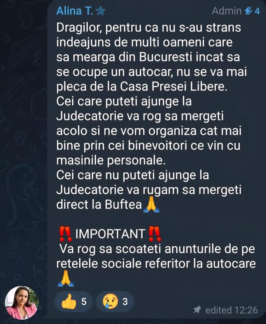 Pe grupurile de Telegram ale susținătorilor, aceștia deja se organizează să fie alături de suveranist și la Judecătoria Sectorului 1, și la Poliția Buftea. Totuși, se pare că nu au reușit să se strângă de un autocar, așa că vor veni cu mașinile personale. De remarcat faptul că nu vor să pară deloc organizați.