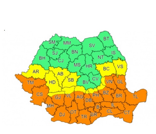 De asemenea, ANM a emis și COD PORTOCALIU pentru intervalul 13 iulie, ora 15:00 – 14 iulie, ora 08:00 pentru instabilitate atmosferică accentuată. În intervalul menționat în Crișana, Maramureș, cea mai mare parte a Transilvaniei, jumătatea nordică a Moldovei și local în Banat vor fi perioade cu instabilitate atmosferică accentuată. Aceasta se va manifesta prin intensificări ale vântului (rafale de 70…90 km/h și izolat de peste 100 km/h), vijelii puternice, grindină de medii dimensiuni, frecvente descărcări electrice și averse torențiale (în intervale scurte de timp, de 1 până la 3 ore,