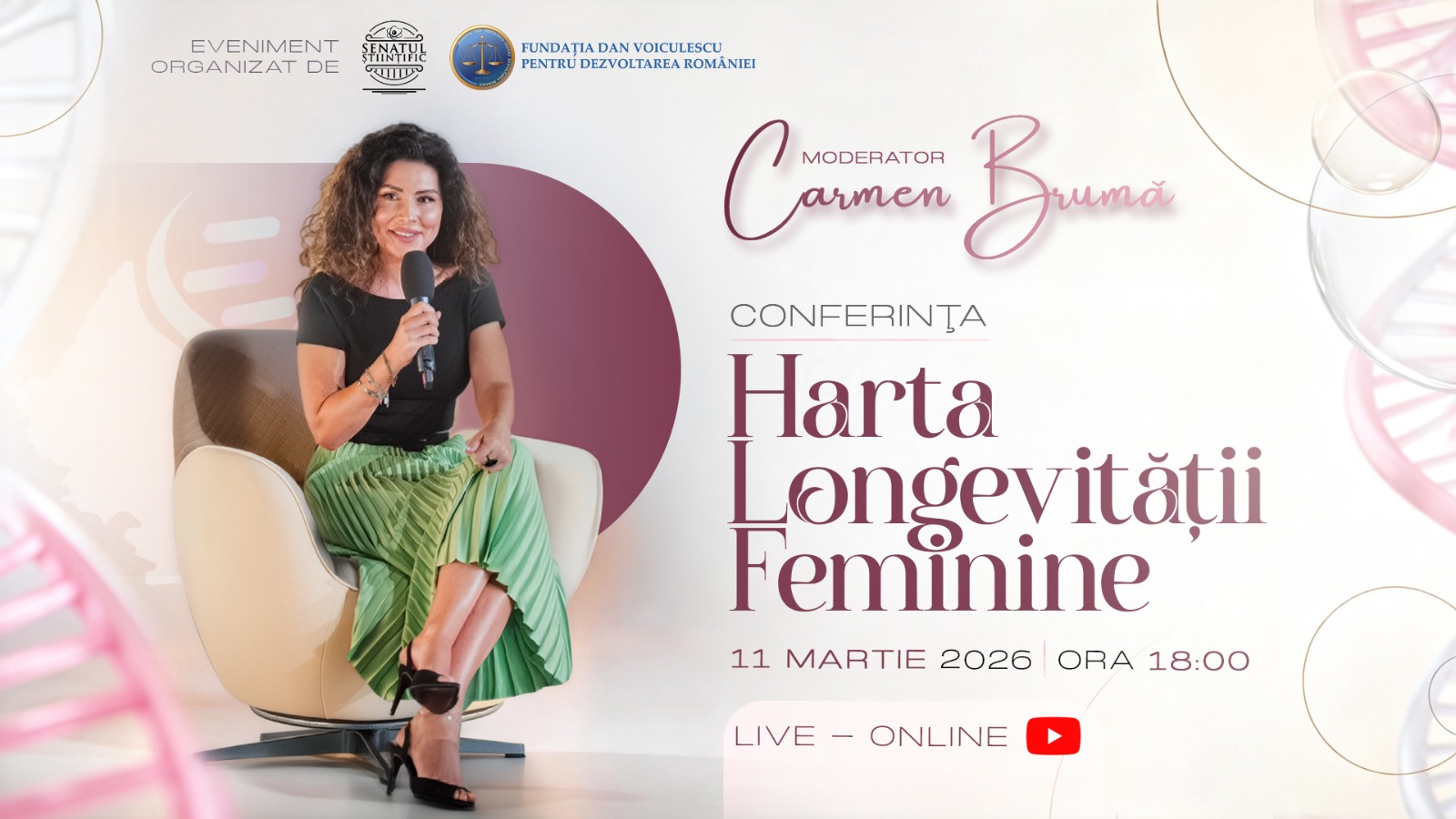 Organizată de Senatul Științific al Fundației Dan Voiculescu pentru Dezvoltarea României, conferința va avea loc miercuri, 11 martie, începând cu ora 18:00 și va fi moderată de Carmen Brumă. Transmisiunea va fi disponibilă live pe canalul de Youtube și pe pagina de Facebook ale fundației, oferind un spațiu de dezbatere pentru specialiștii care studiază adaptarea organismului feminin la trecerea anilor.