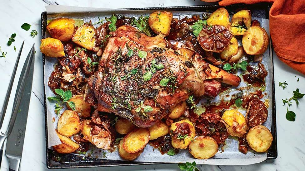 2. Se pune tava in cuptorul preincalzit la 180 grade C timp de 1 ora, se scoate din cuptor si se adauga cartofii, se acopera din nou cu folie de aluminiu si se mai pune la cuptor inca 20 minute. Atentie la cartofi, bucatile (sau cuburile) nu trebuie sa fie prea mari, astfel incat sa se poate coace in 20 minute.