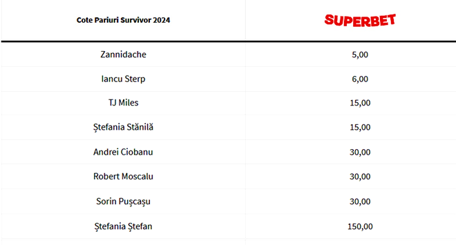 Potrivit cotelor la zi de pe Superbet, Ștefania Ștefan are cele mai mici șanse să câștige competiția. Cu o cotă de 150, probabilitatea ca ea să devină marea câștigătoare sunt aproape nule.