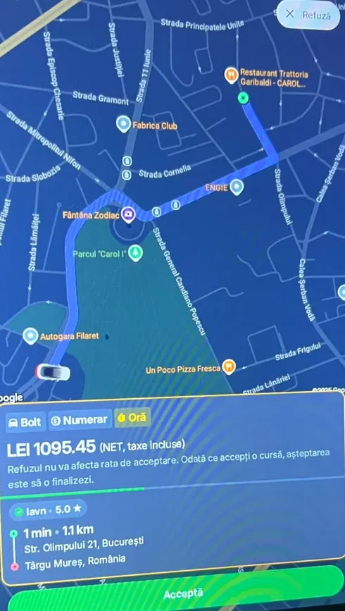 Aplicația Bolt a estimat un cost de 1.095,45 lei pentru această cursă de aproximativ 350 de kilometri, potrivit unei imagini postate pe un grup de Facebook dedicat șoferilor de ridesharing, scrie Gândul. Fotografia, făcută pe tableta șoferului care primește comenzile prin Bolt, a devenit rapid virală, după ce acesta a glumit în descriere: „Ce spuneți, este bună cursa?🤣”.