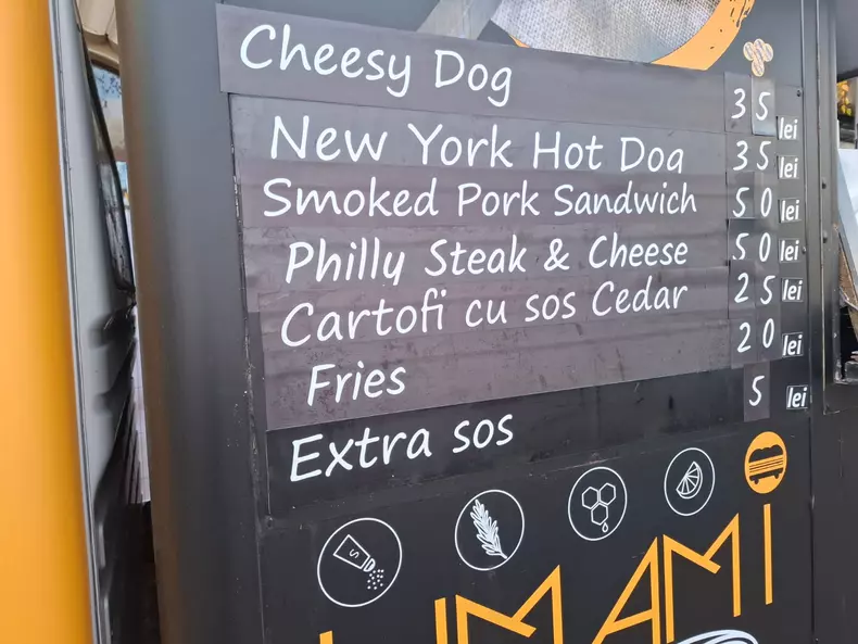 Alte prețuri de la Bucharest Downtown Christmas Market sunt: cheesy dog – 35 de lei, cartofi prăjiți – 20 de lei, the dip and beef (supă de vită) – 37 de lei, the pig deal (sandwich de porc) – 33 de lei, salată – 15 lei, dogzilla (wurst monstruos de mare la grătar cu mozzarella, castraveți murați, ceapă crocantă și sos curry) – 50 de lei.