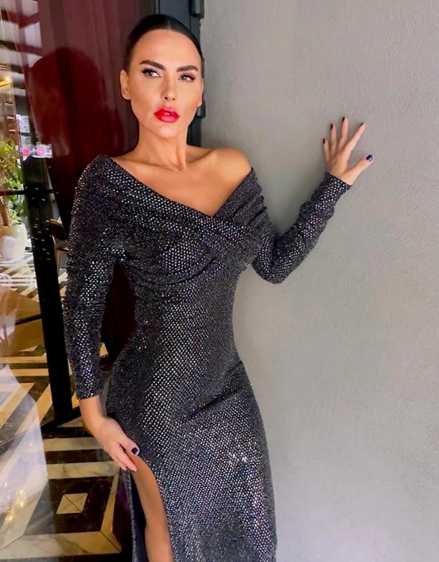 Rochia Evelin, la prețul de 1.000 de lei, e mulată, cu decolteu adânc, accentuat de guler drapat, petrecut cu mâneci lungi și șliț pe picior.