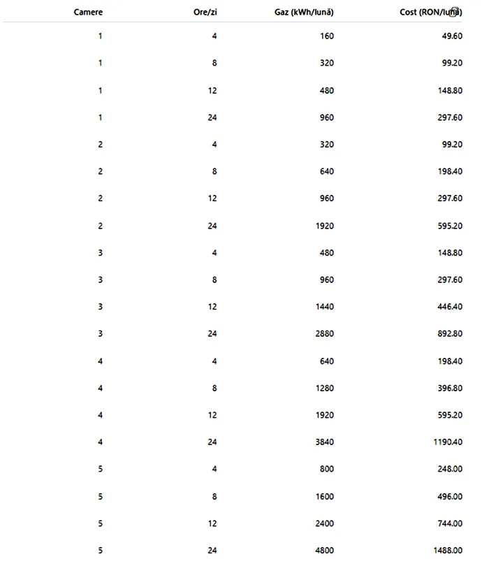 Astfel, la un preț al gazului de 0.31 ron / kWh (TVA inclus), plafonat în 2025, cu o eficiență a centralei de 90%, mai exact pentru 1 1 kWh termic livrat, centrala consumă ≈1/0.9 = 1.11 kWh gaz și cu o putere termică per cameră de 1.2 kW, românii vor trebui să scoată din buzunar după cum urmează.
