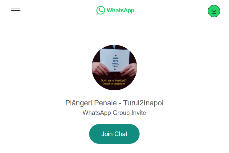 Link-ul trimite la un grup de WhatsApp intitulat „Plângeri Penale – Turul2Inapoi”, unde susținătorii săi se organizează pentru a depune plângeri penale pentru „fraudarea alegerilor”.