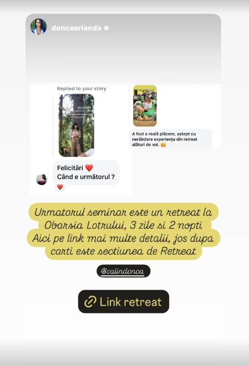Orianda Donca (35 de ani) are o condiţie fizică de invidiat, face mult sport şi deţine o sală de fitness, iar acum ţine seminare în natură. Recent, a postat pe InstaStory un clip în care le vorbea cursanţilor despre dependenţa de partener şi are inclusiv susţinerea soţului ei în acest domeniu, scrie as.ro.