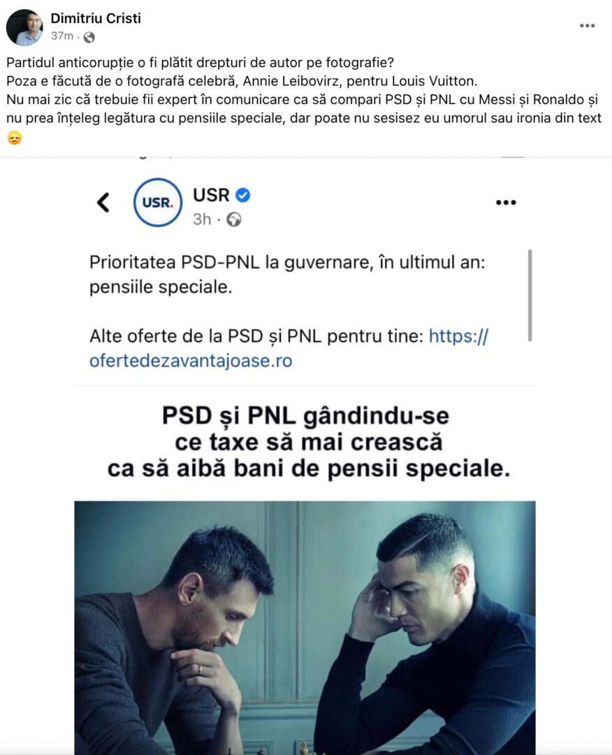„M-am săturat să fiu neplăcut cu USRul, but still: nu e ok (nici moral, nici legal) să folosești poze luate de pe net și să scrii în comentarii, ca ultimul prost, „sursa foto blablabla”. Ești un partid politic? Plătești pentru toate materialele media pe care le folosești, și dacă n-ai 5 milioane de euro sau cât o fi o poză cu Messi și Ronaldo, făcută de Annie Leibovitz, ia-ți una de 10 dolari de pe stock.” a fost postarea omului de publicitate Alex Tocilescu.