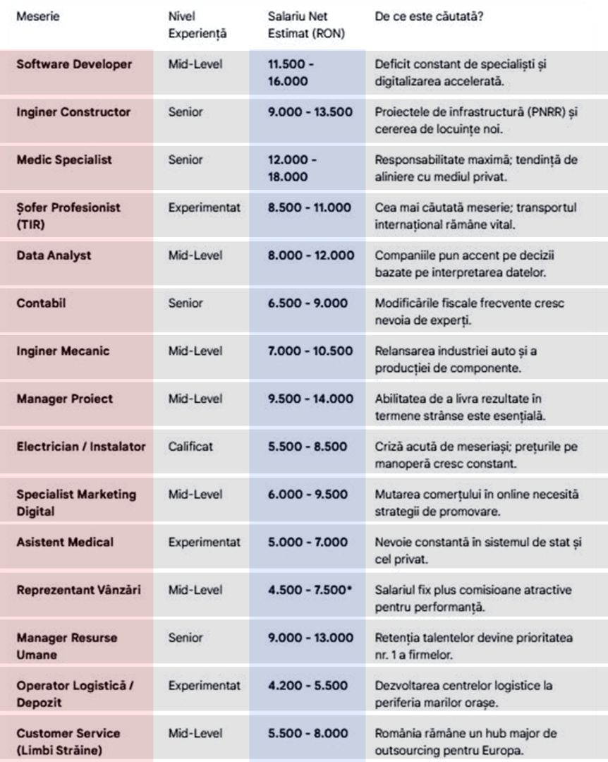 În tabelul de mai jos au fost selectate 15 dintre cele mai populare și căutate meserii, bazate pe date actuale de recrutare, dar și pe prognozele economice pentru 2026, potrivit Gândul.