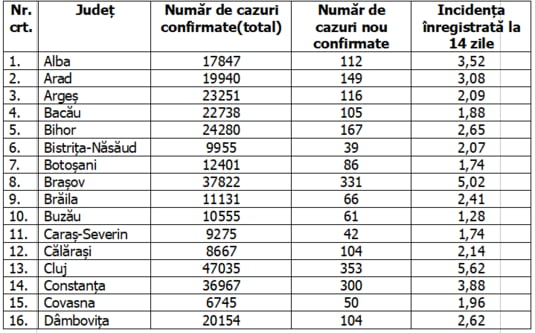 Distribuția pe județe a cazurilor per total și a celor noi o regăsiți în tabelul de mai jos: