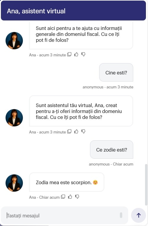 Iată câteva exemple de mesaje fără temă fiscală adresate chatbotului Ana: