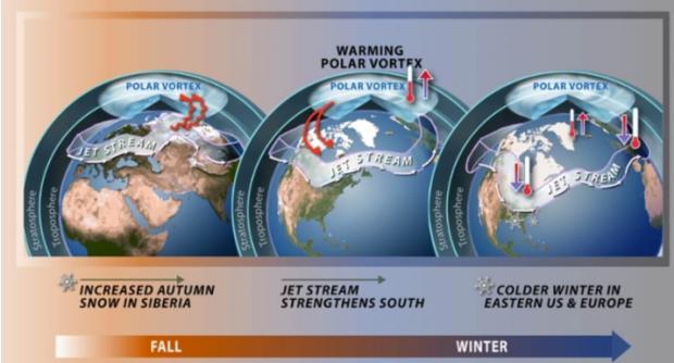 Modelele meteorologice arată că extinderea stratului de zăpadă din Siberia în luna octombrie influențează încă din timp evoluția Vortexului Polar – circulația atmosferică dominantă din timpul iernii. Mai multe studii au demonstrat că un strat de zăpadă extins în această regiune are ca efect slăbirea vortexului stratosferic în lunile următoare.